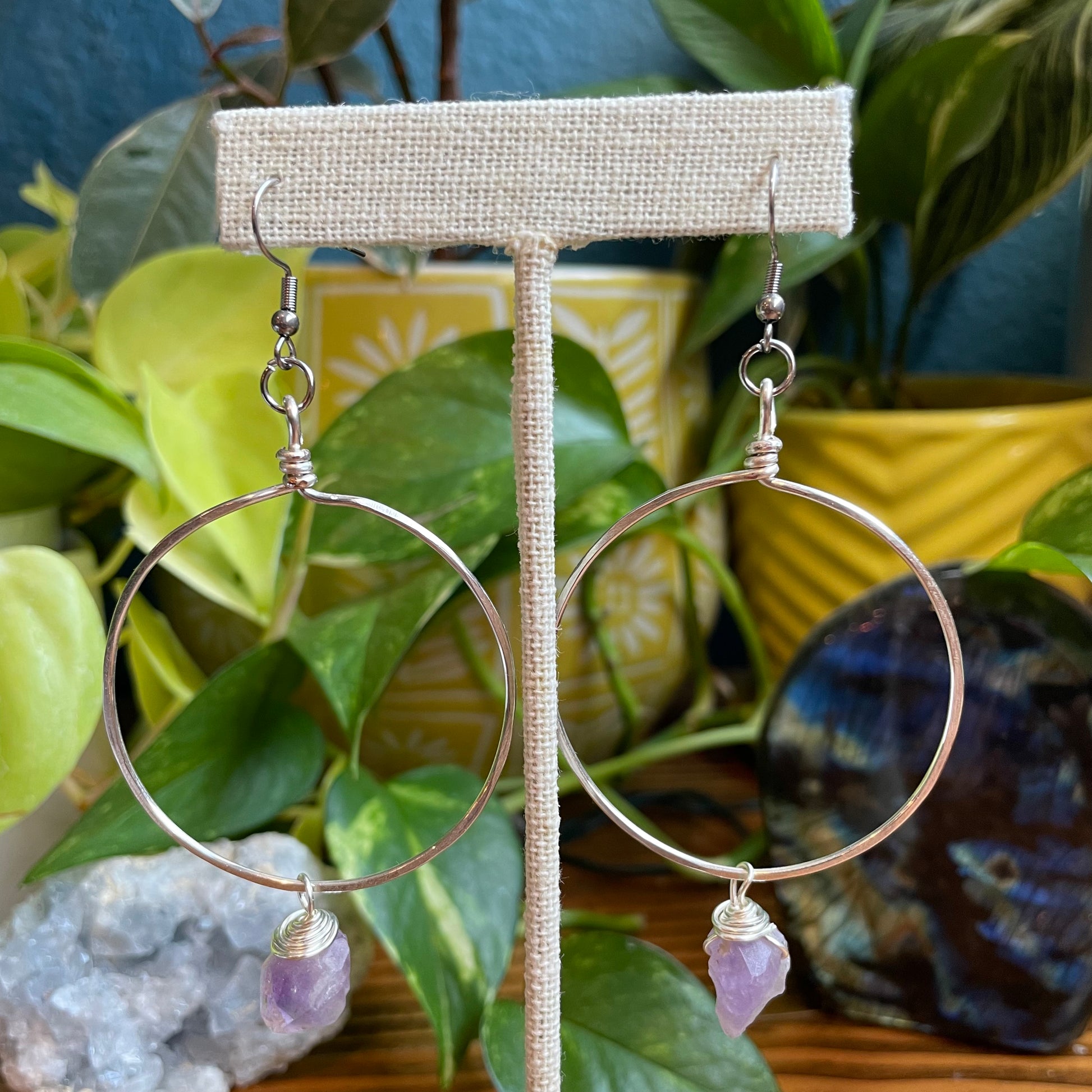 Raw amethyst silver hoops on stainless steel hypoallergenic backings