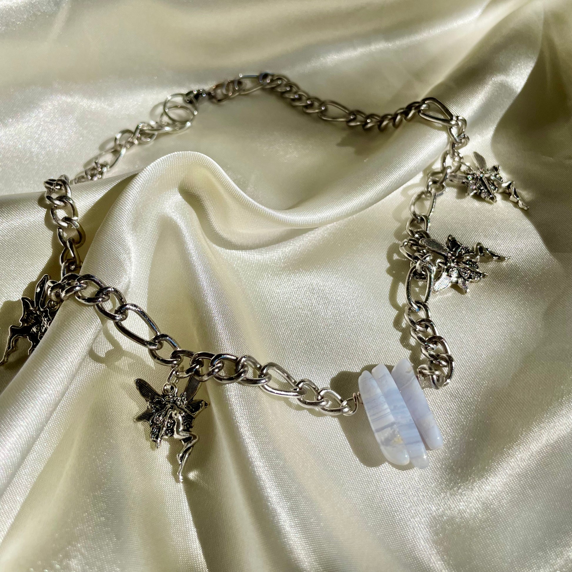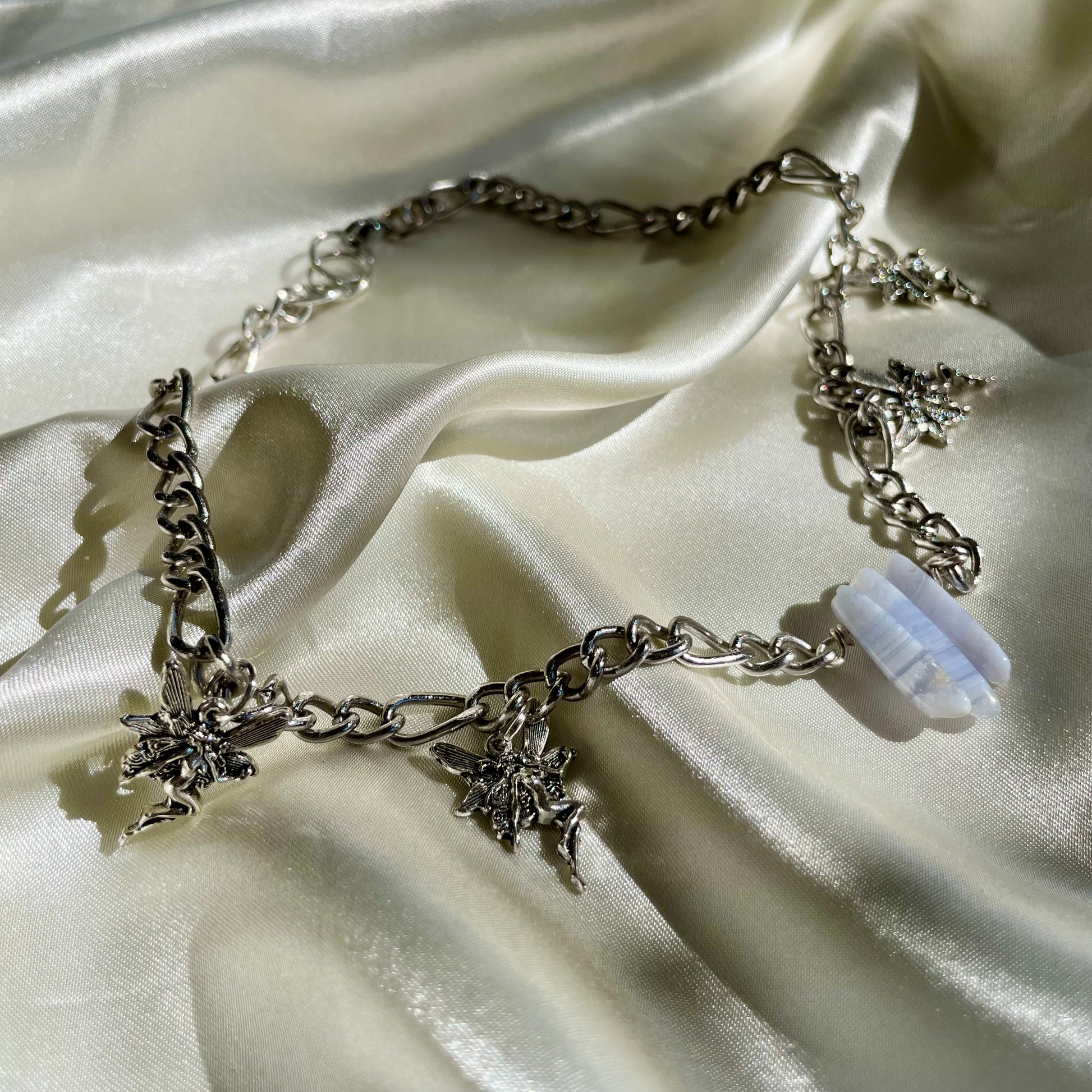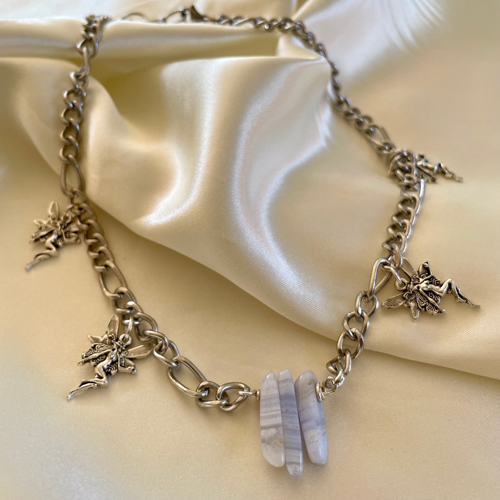 The Blue Lace Agate "Fairy" choker includes three polished blue lace agate points accented with a non-tarnish silver plated 15" chain and four fairy charms. This is the perfect statement piece and a JTN exclusive.