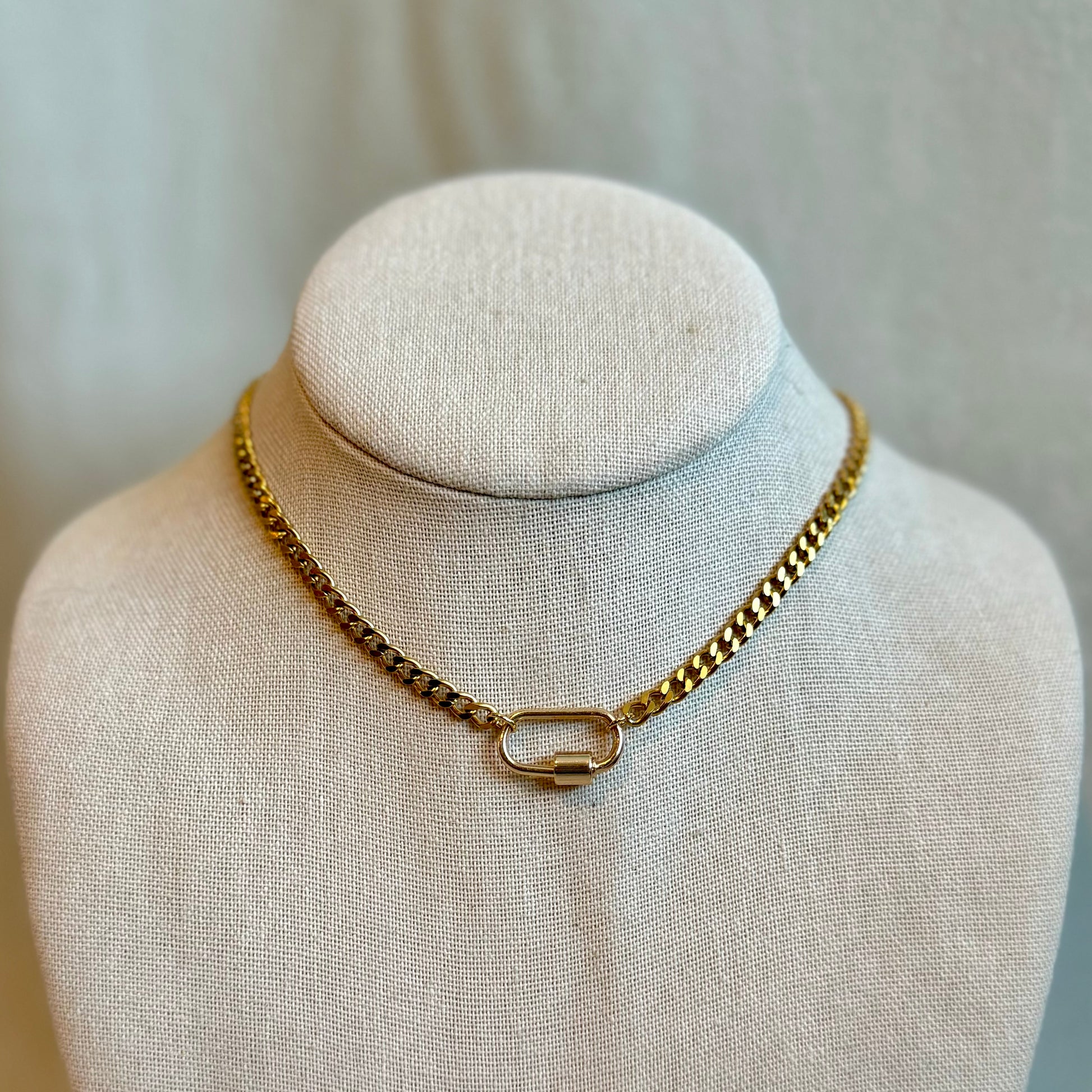 Carabiner choker on 16” 18k non-tarnish gold plated stainless steel chain