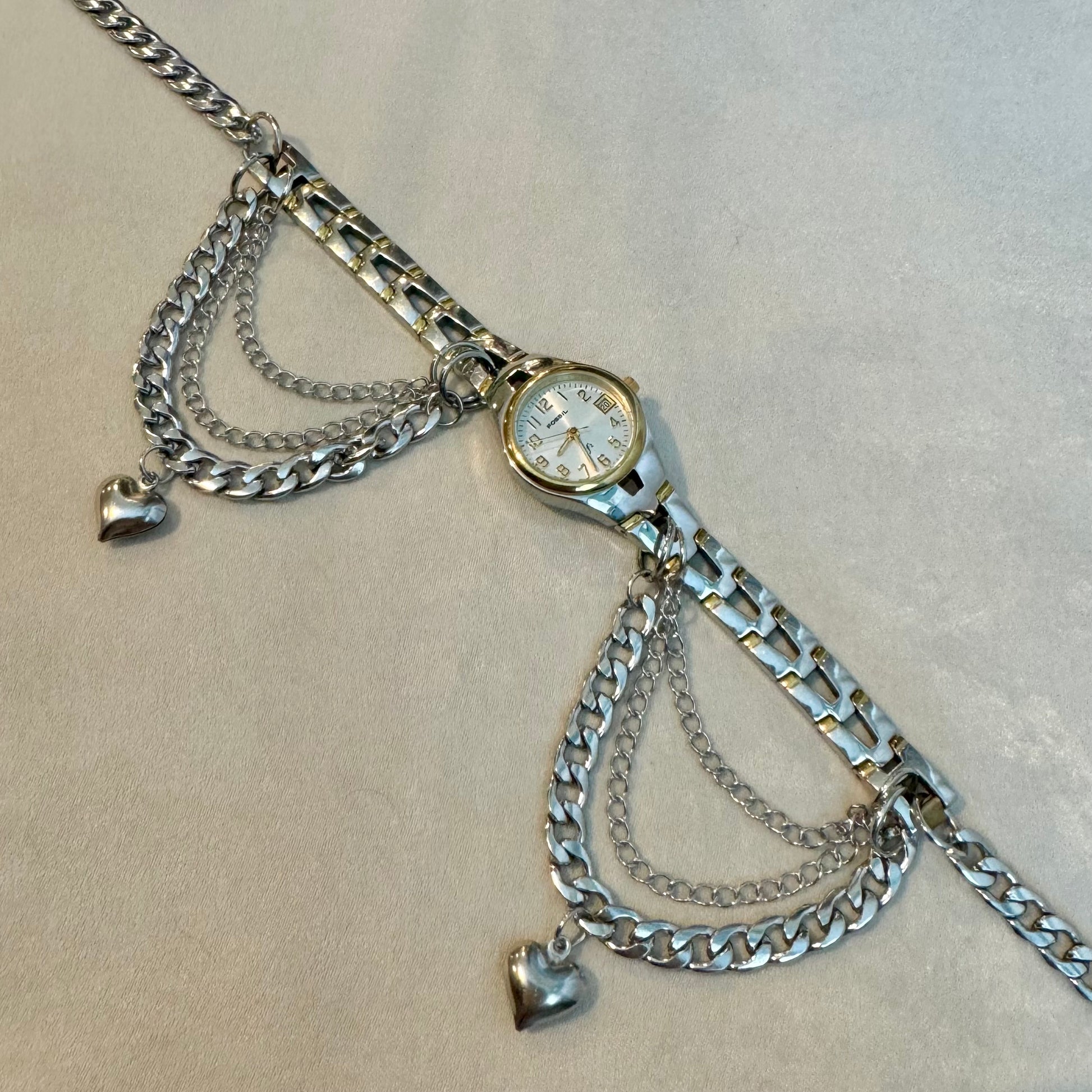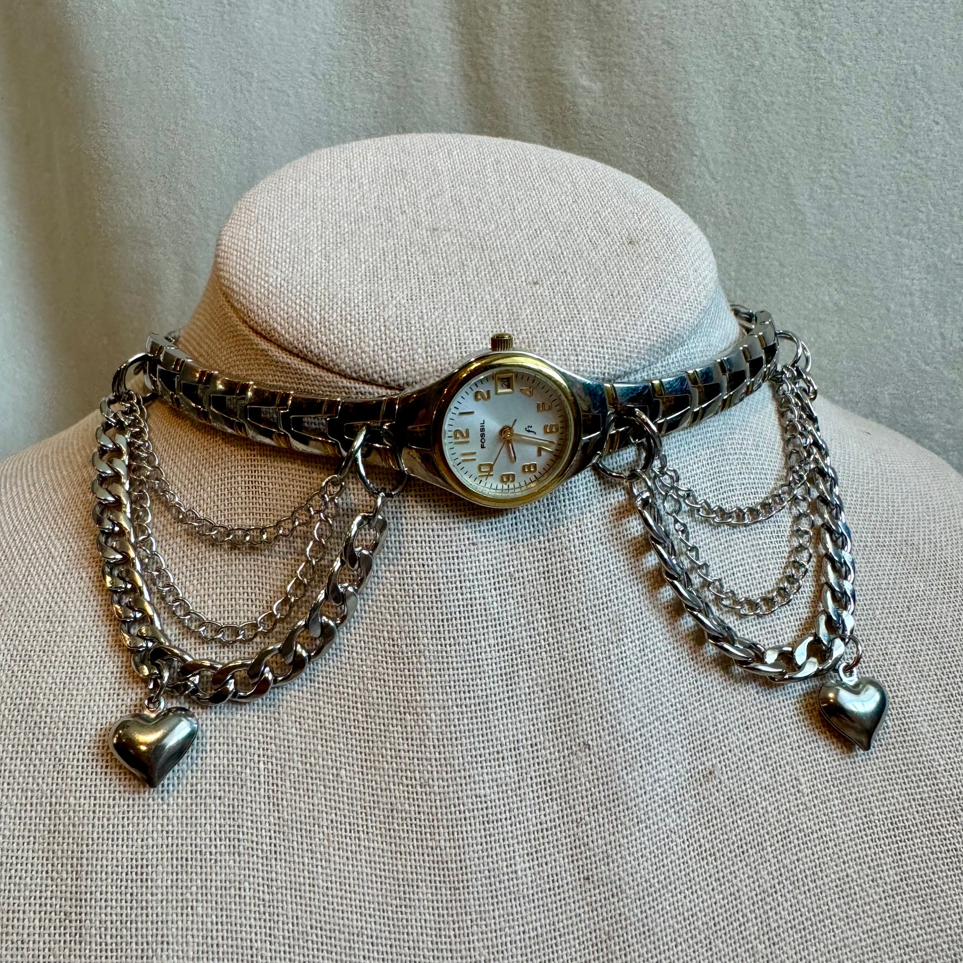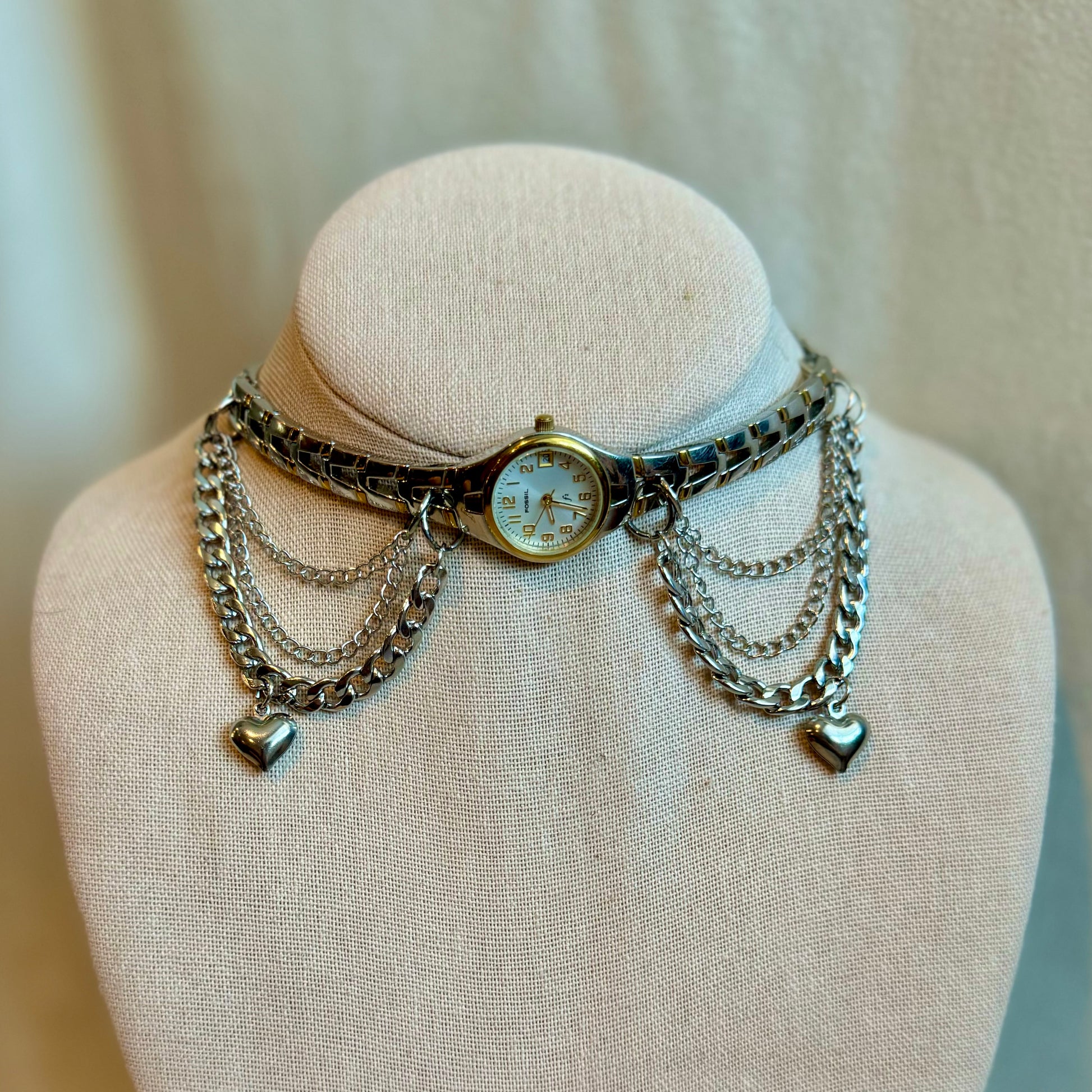 1 of 1 eclectic watch choker featuring stainless steel chain and findings, accented with steel heart charms. Adjustable length 14-18”