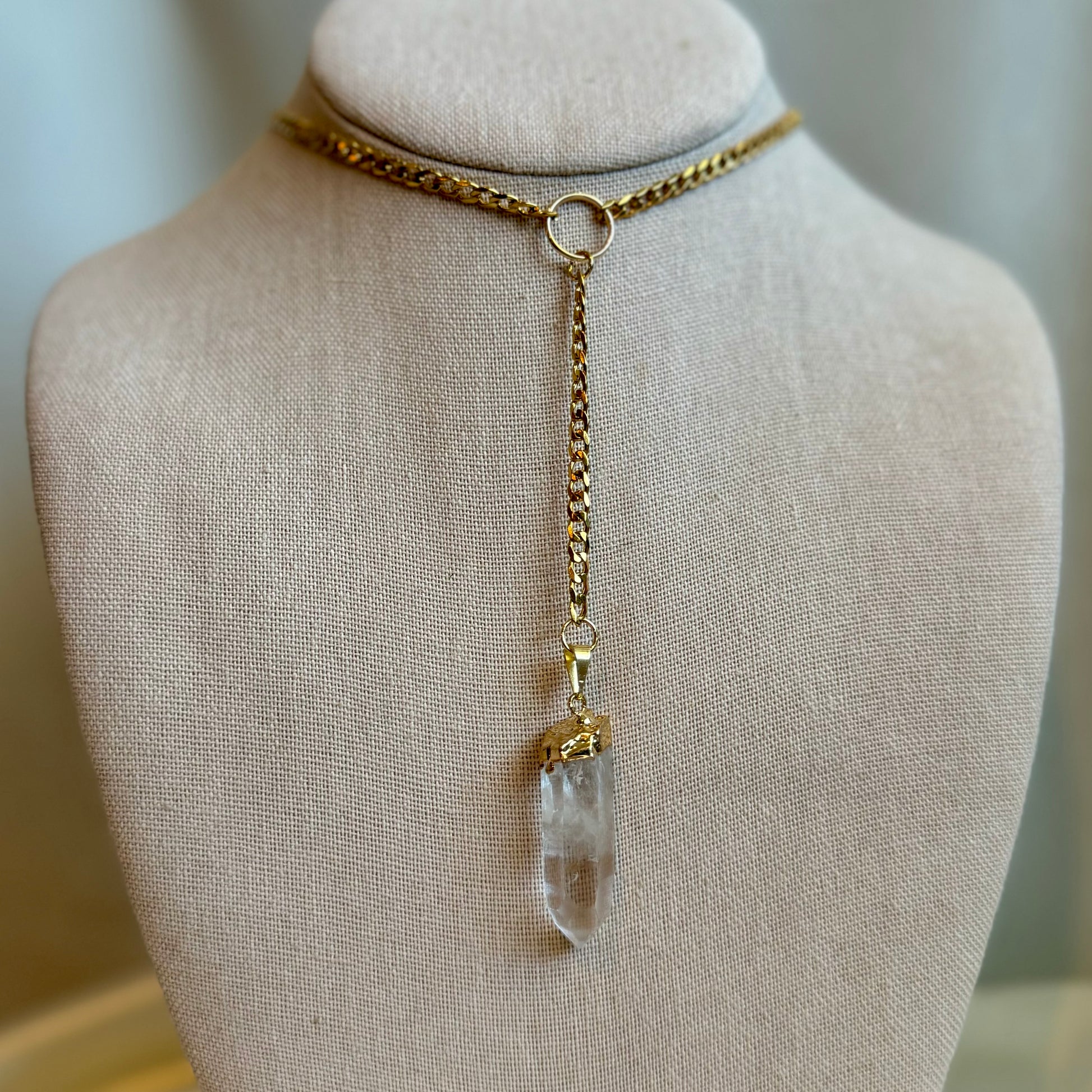Clear Quartz Gold Lariat Necklace on 15-16” 18k gold plated stainless steel chain