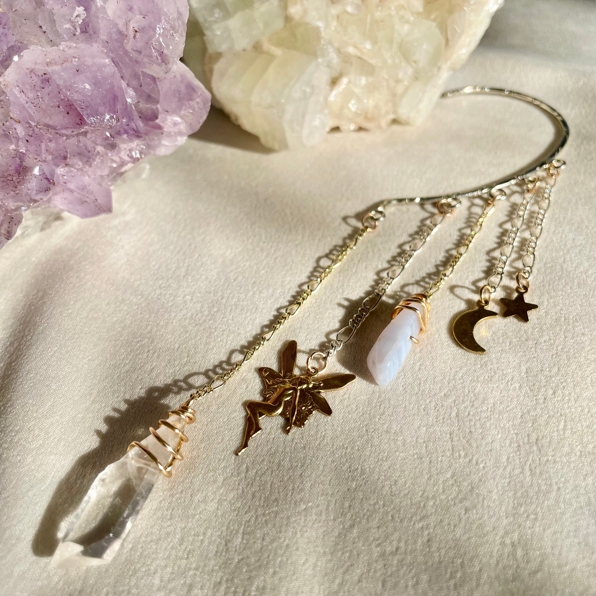 The "Forest Fairy" Ear Cuff includes one ear cuff featuring clear quarts and blue lace agate adorned in mixed metal.