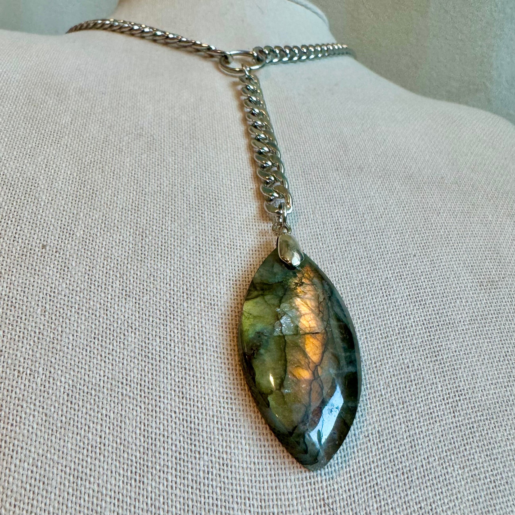 Labradorite Stainless Steel Lariat Necklace on 15-16” chunky chain