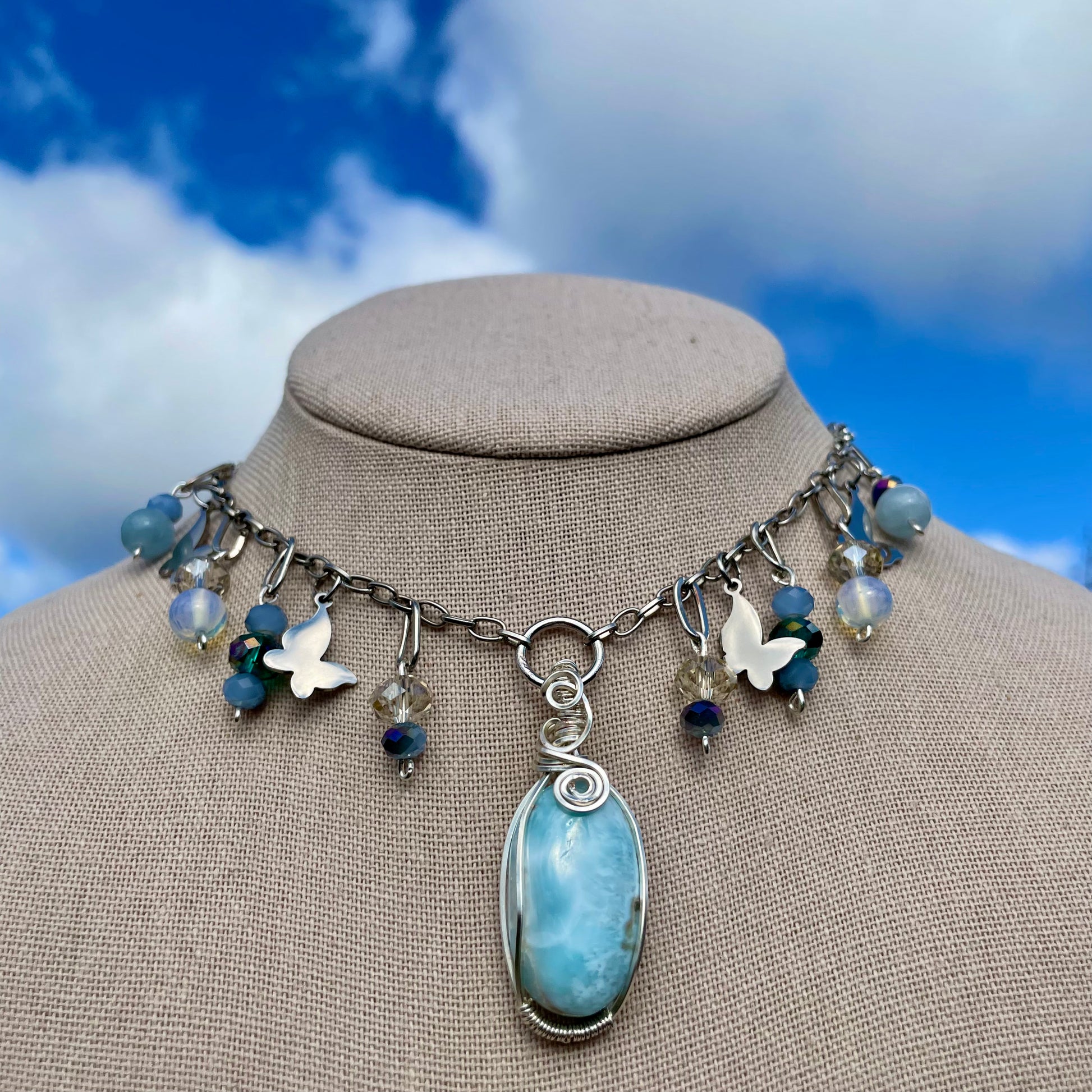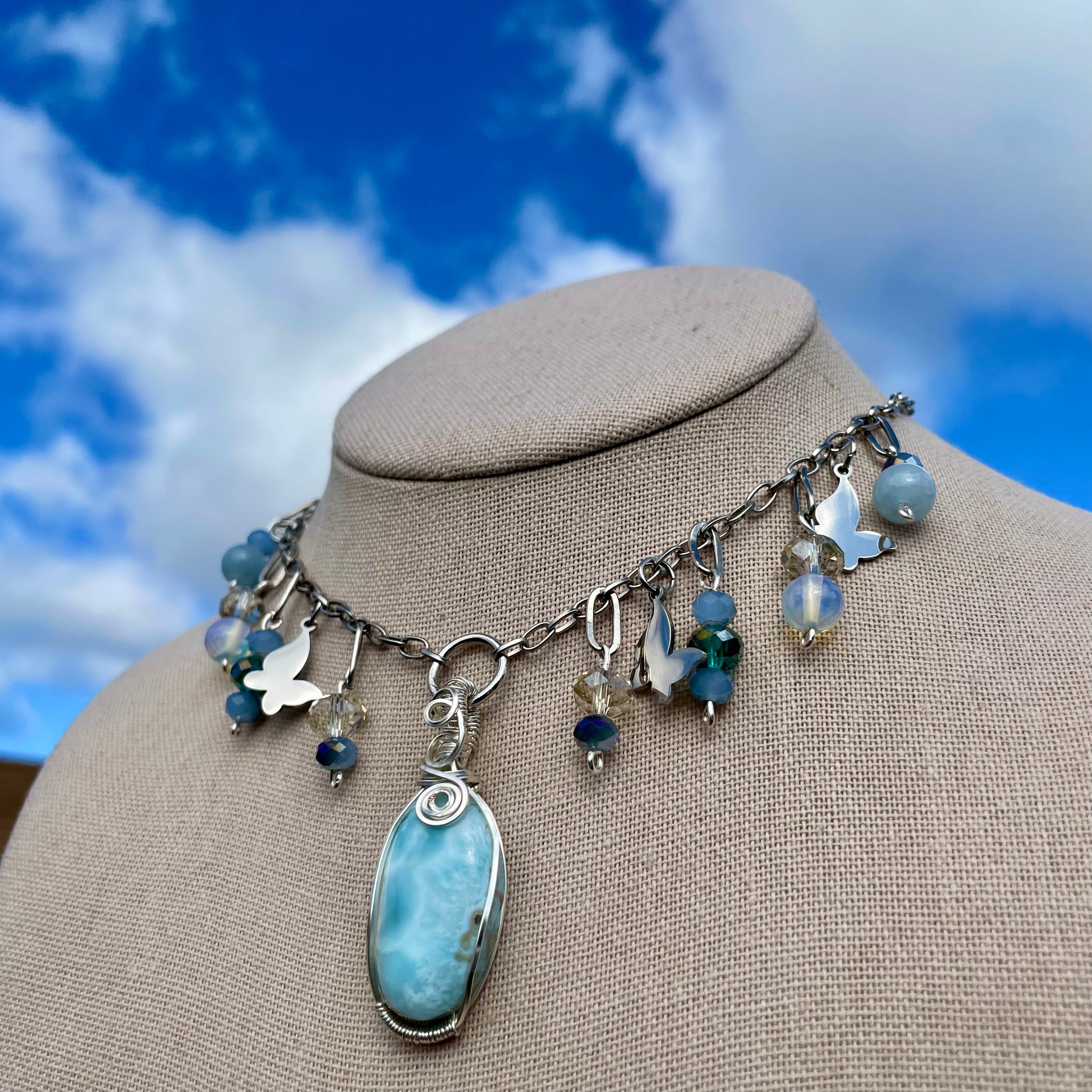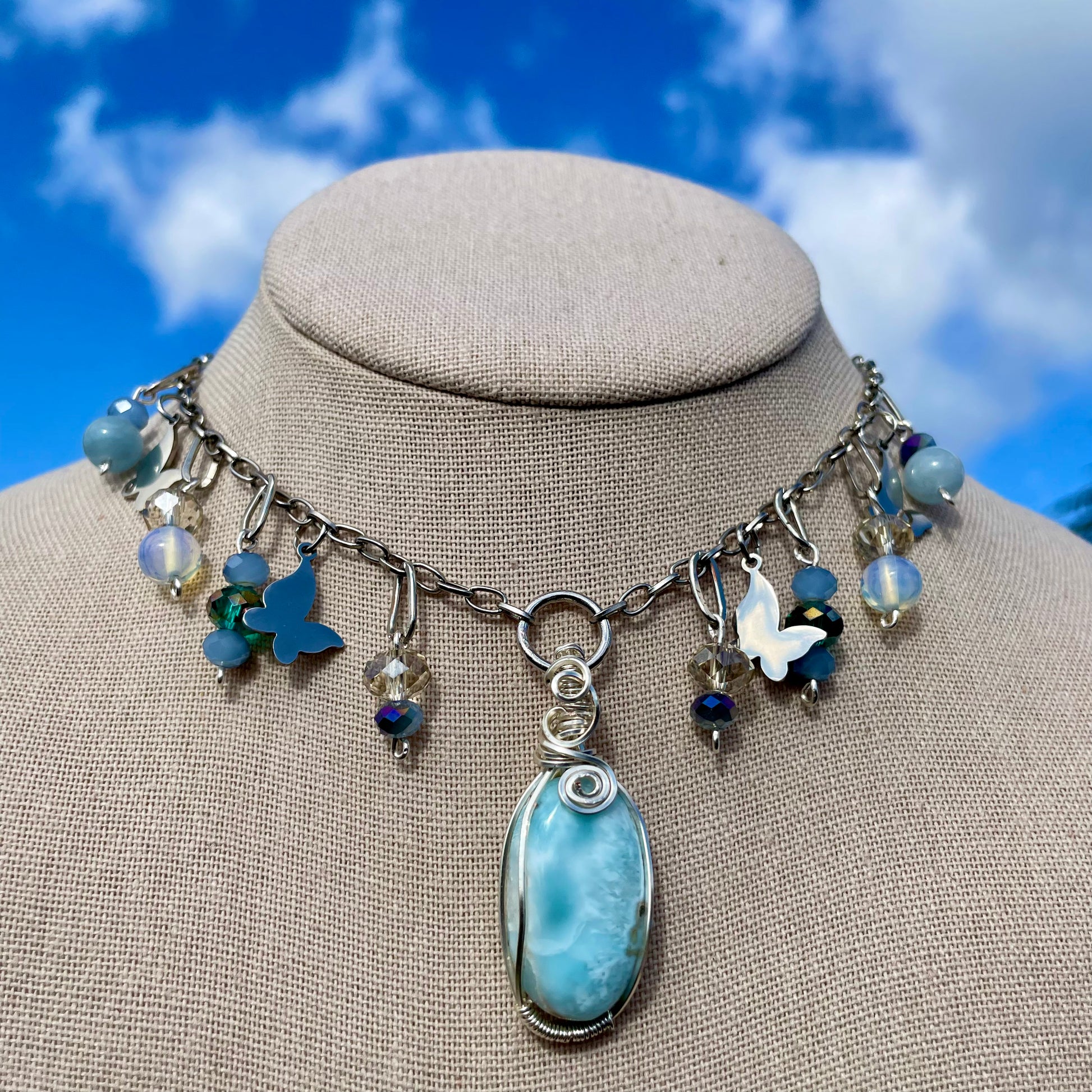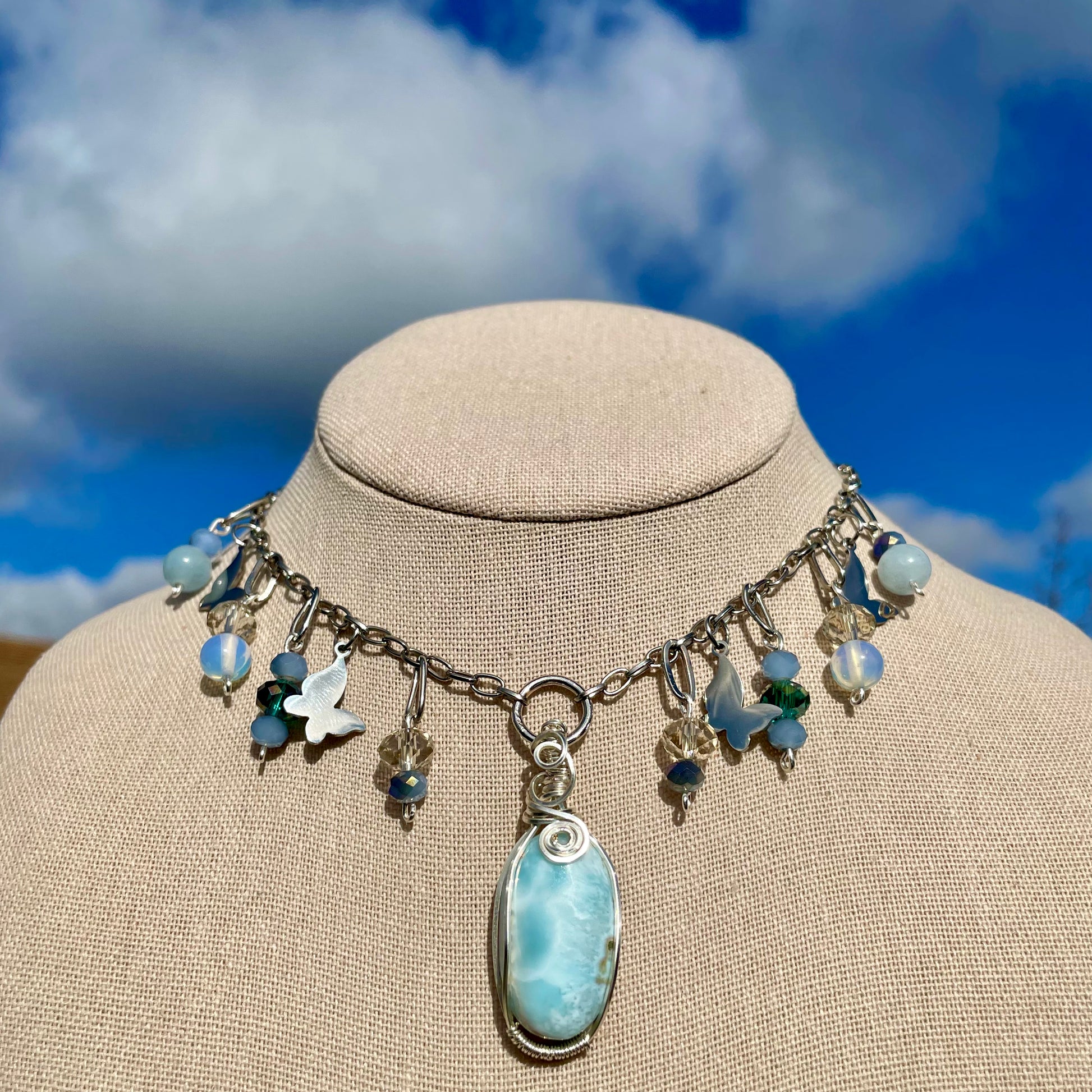 A 1 of 1 original statement choker featuring high quality Larimar, aquamarine, opalite, and up-cycled crystal beads. The crystal pairing promotes spiritual attunement, intuition, and healing the throat & third eye chakra. Measures 15”-20” adjustable in length.