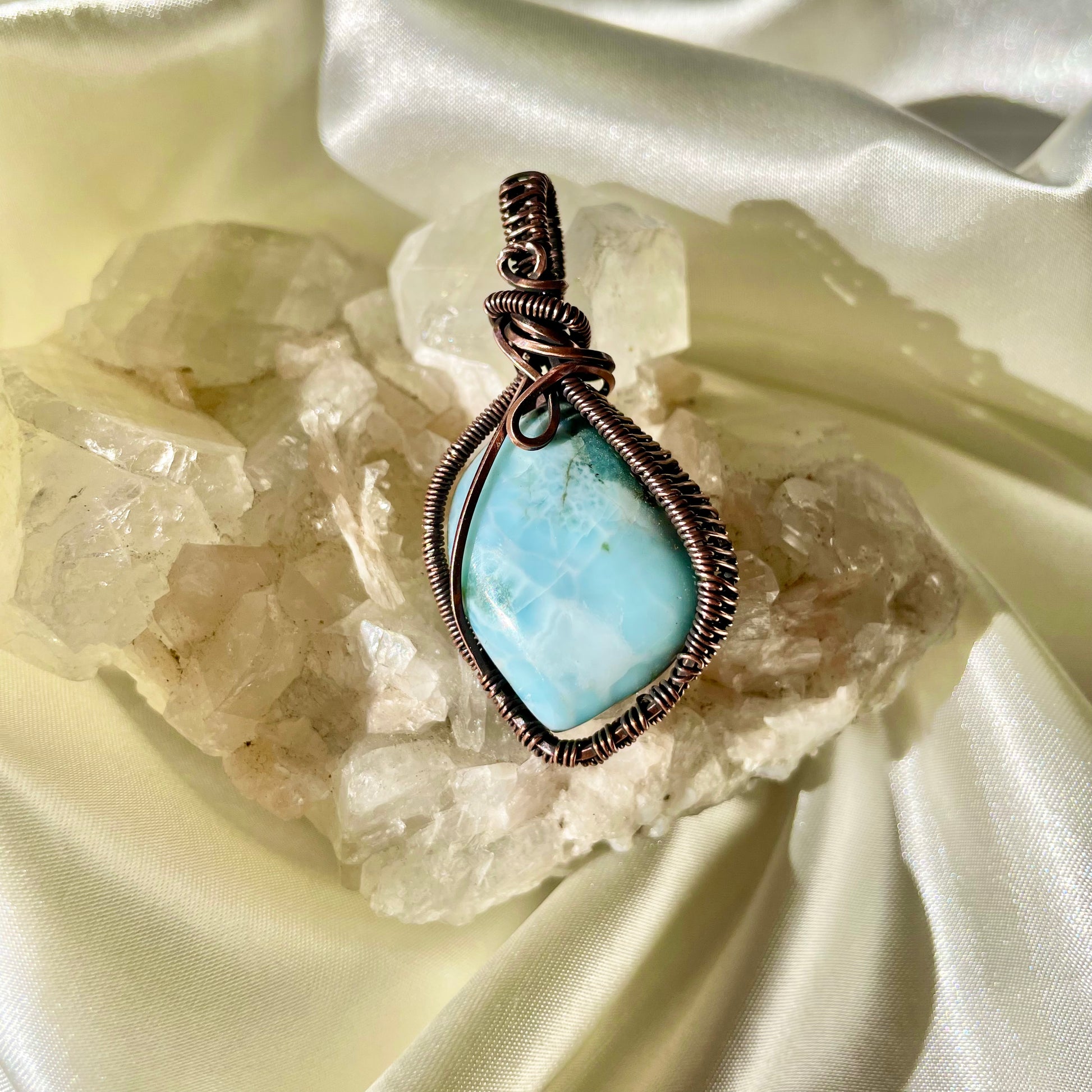 1 of 1 high quality larimar antiqued copper pendant on an 18” adjustable black cord chain.