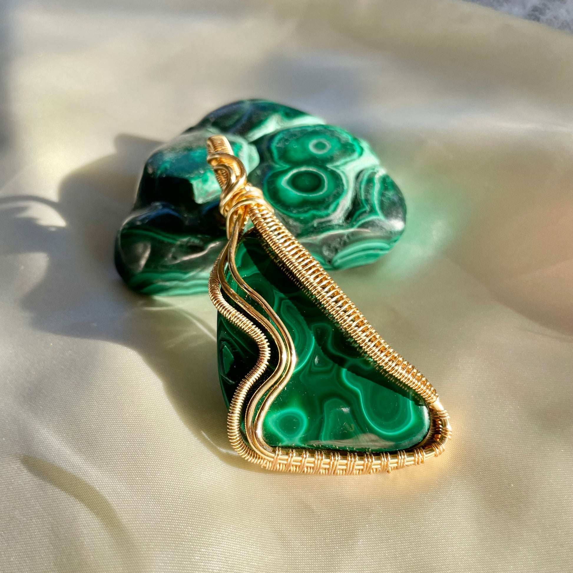A one of one Malachite statement pendant handwoven in pure brass. Malachite symbolizes transformation & growth. Use this talisman as an energetic tool for elevating your journey & manifestations. Pendant includes one 18" adjustable black cord chain.