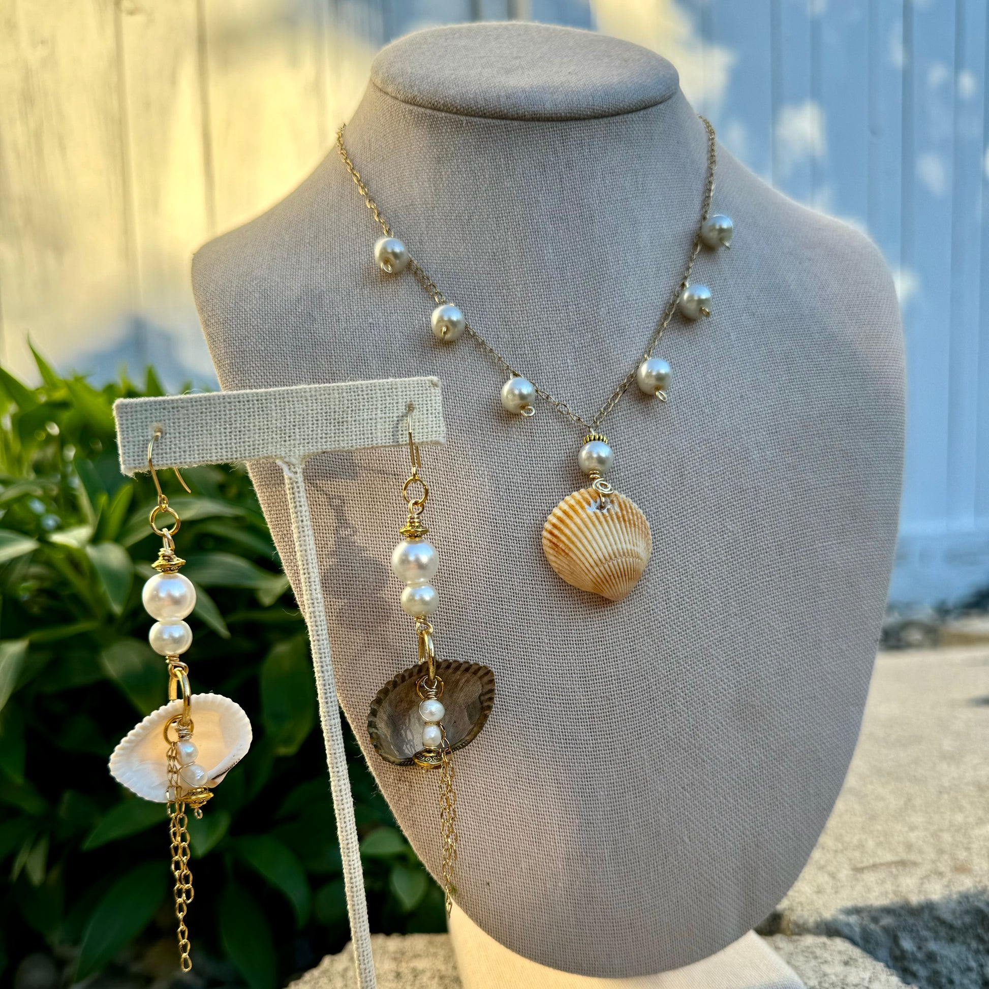 freshwater pearl and hand drilled shells on a 15-18” adjustable length choker