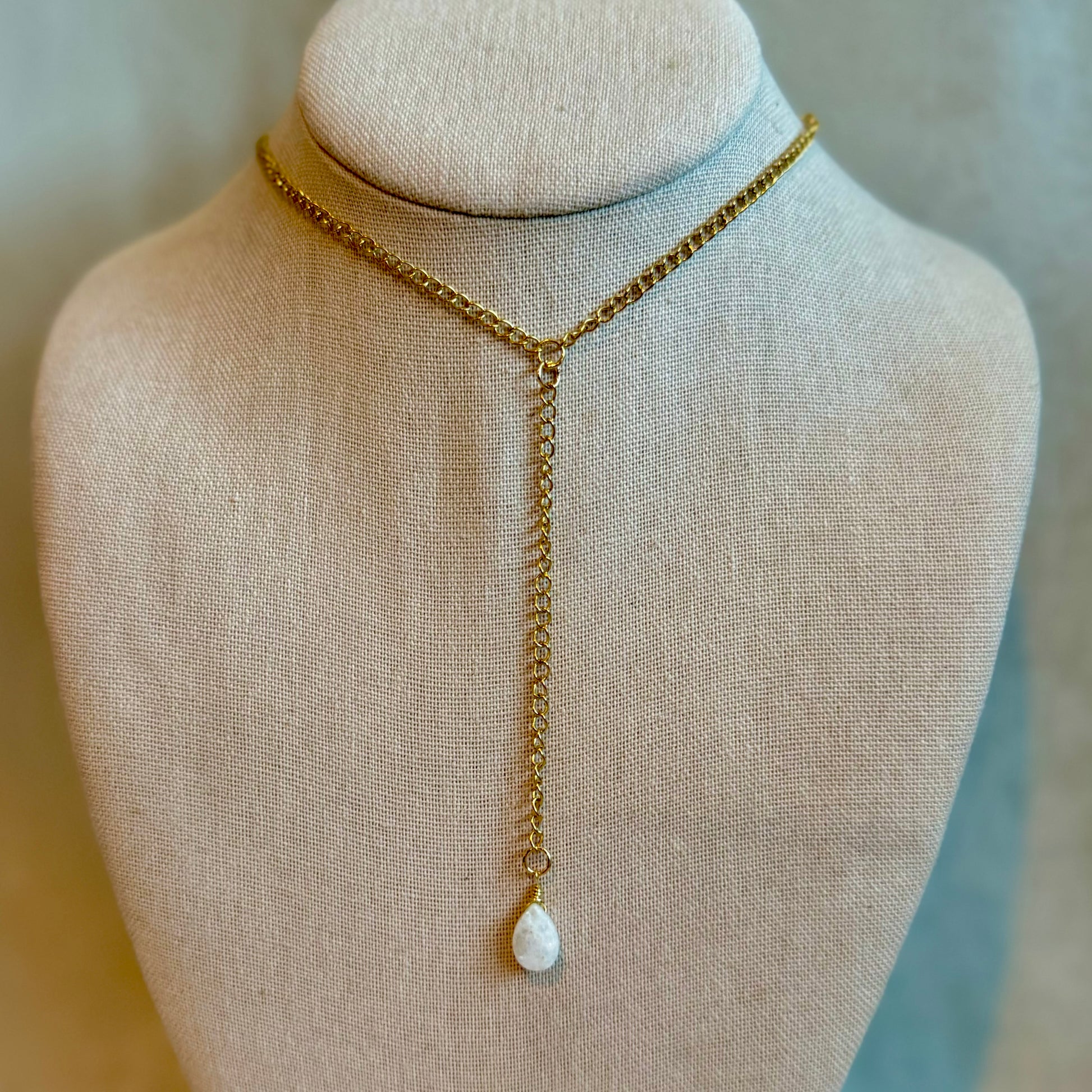 Moonstone Gold Lariat Necklace on 15-16” Y choker featuring stainless steel 18k gold plated chain