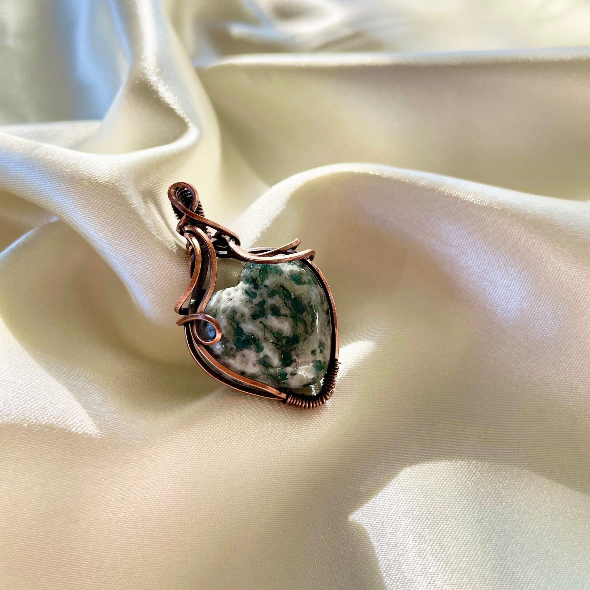 A mini-sized Moss Agate heart shaped pendant, minimally handwoven in antiqued copper. Moss Agate aids in setting one's intentions & encourages emotional balance. The pendant serves as an energetic tool for generating gentle compassion and nurturing the wearer.
