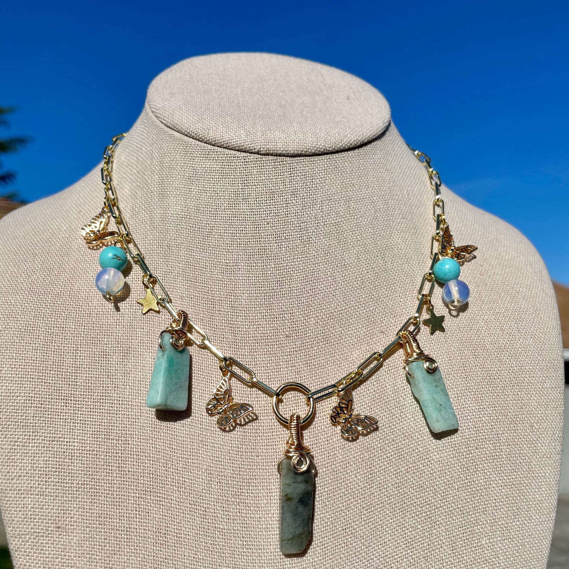 A 1 of 1 multi-stone gold statement choker featuring labradorite, amazonite, turquoise, opalite, with butterfly charms. designed to bring about rebirth & transformation.