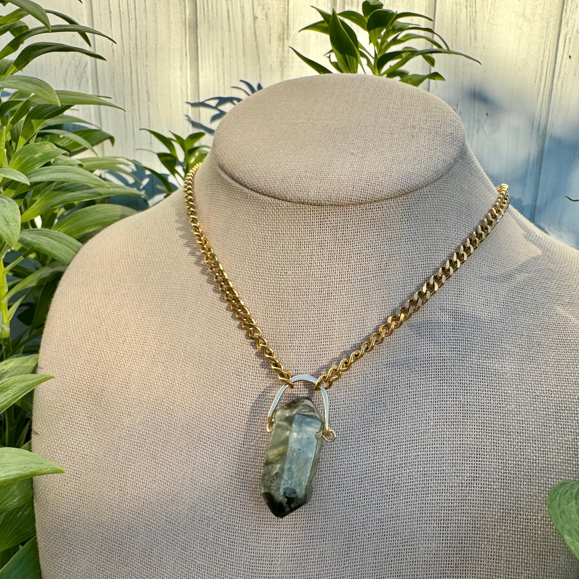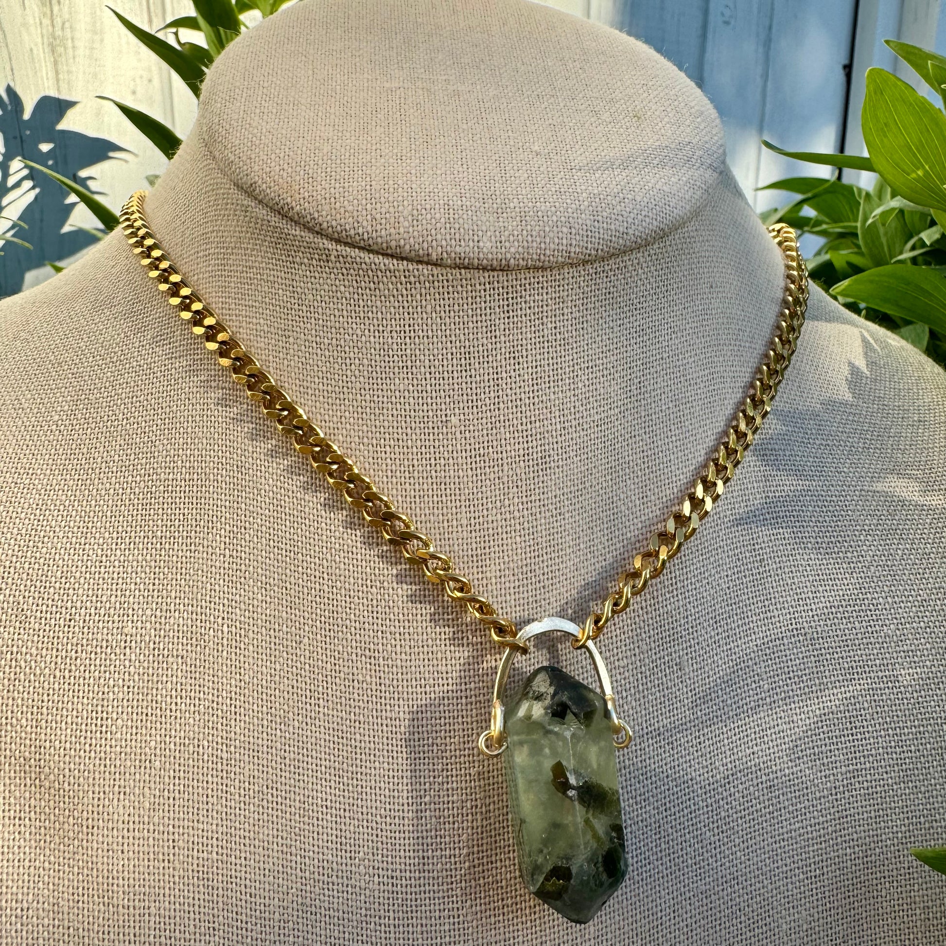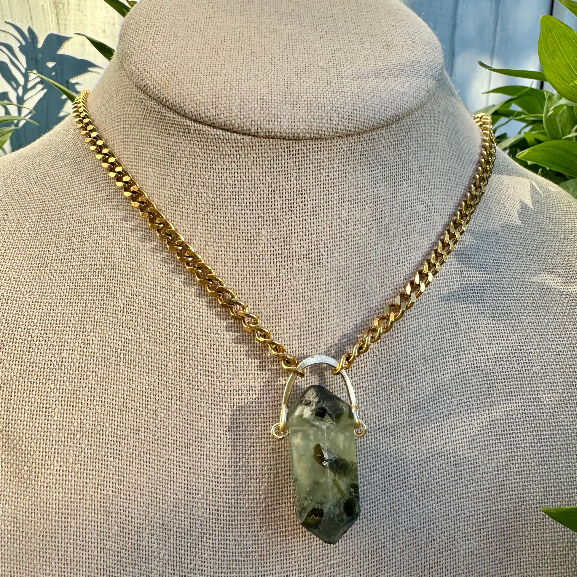 Prehnite gold choker on 18-20” chain.