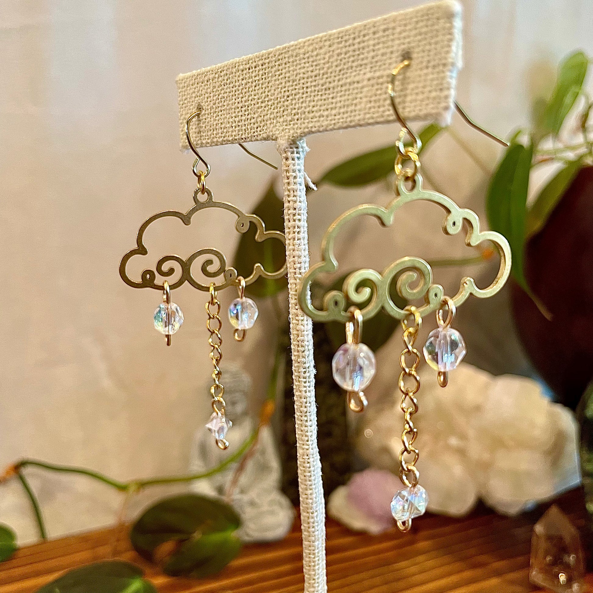 Brass rain clouds earrings with aura iridescent glass beads featuring stainless steel hypoallergenic backings.