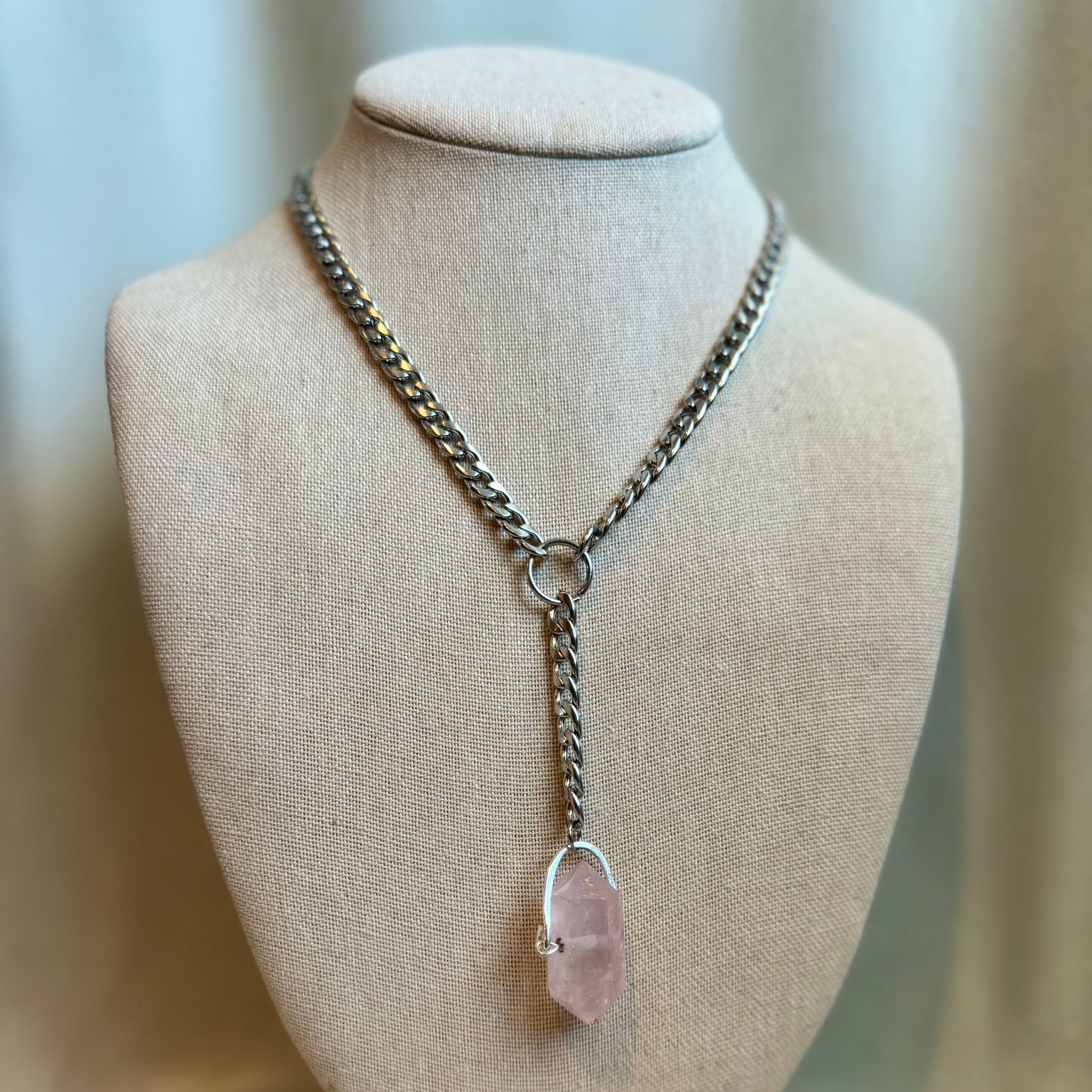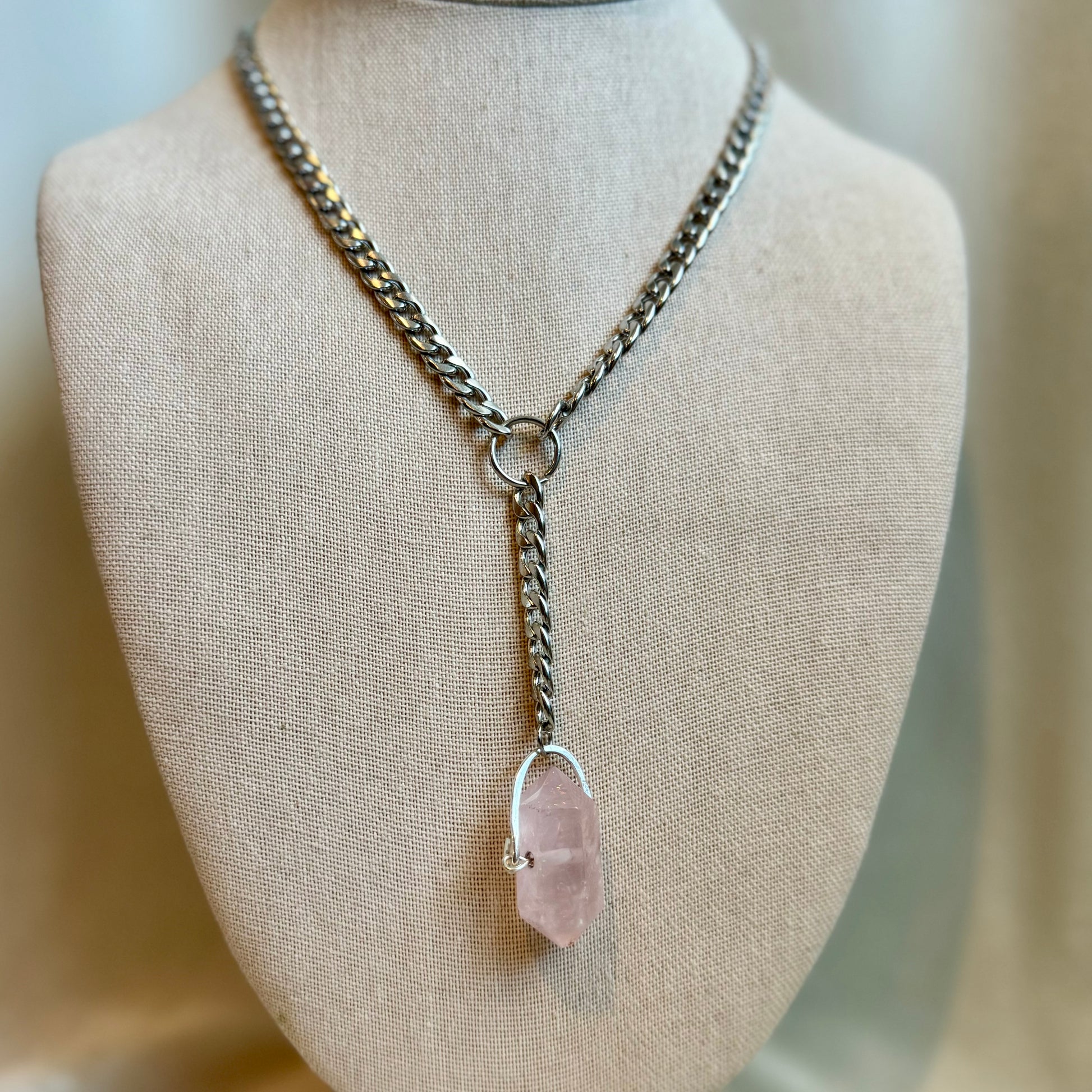 Double Terminated Rose Quartz on 15-17” Stainless Steel chain designed to rest at the heart center offering nurturing compassion