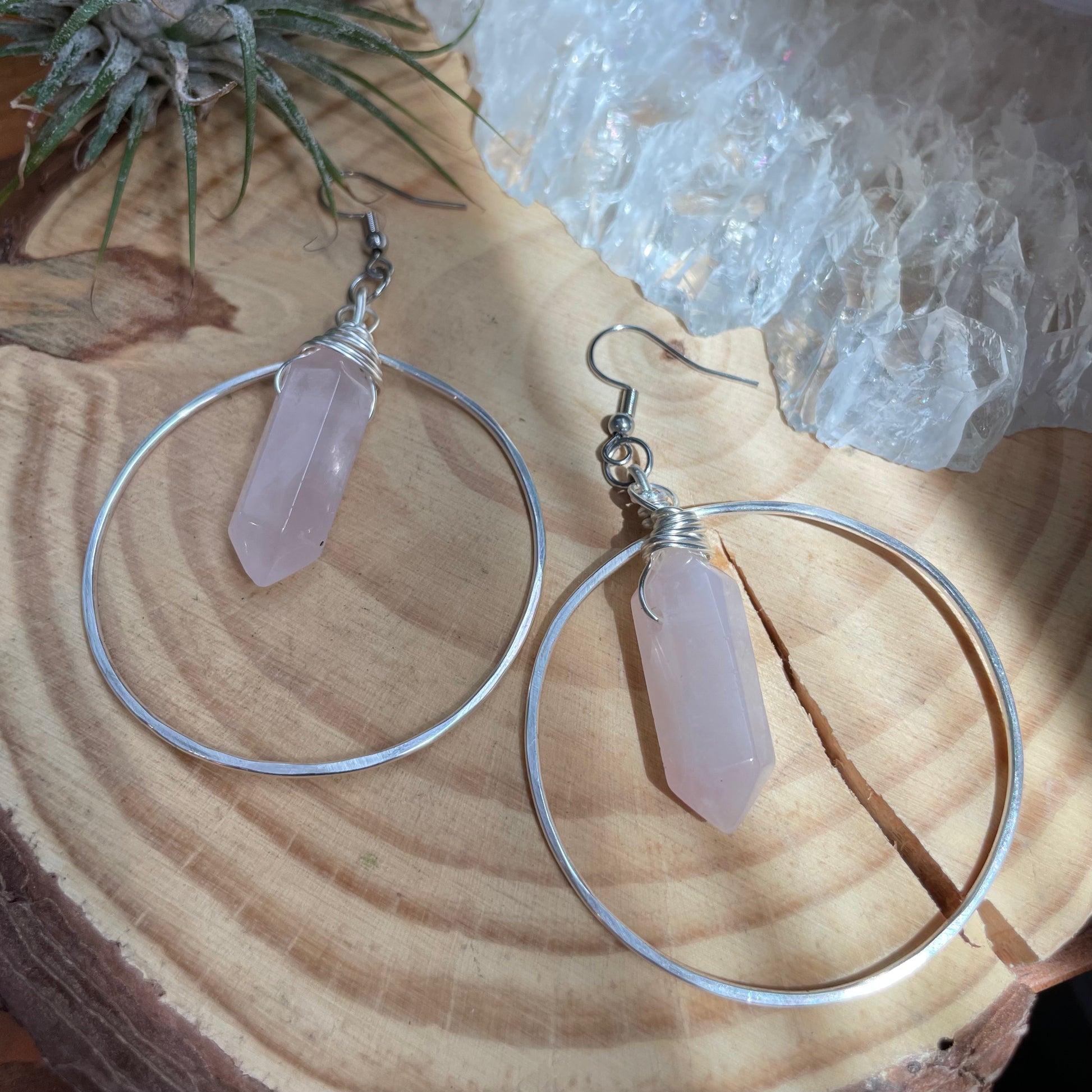 Rose Quartz point silver hoops on stainless steel hypoallergenic backings