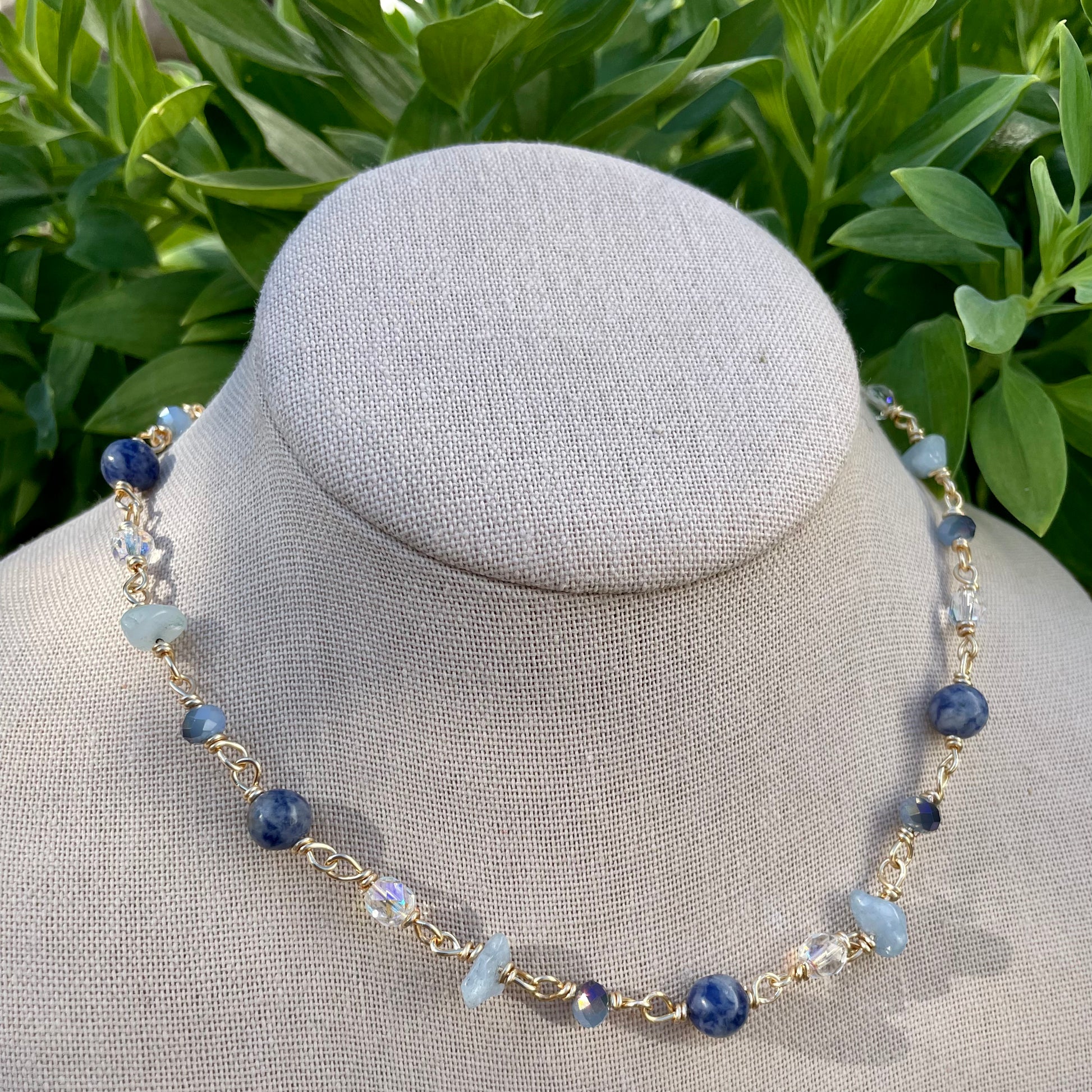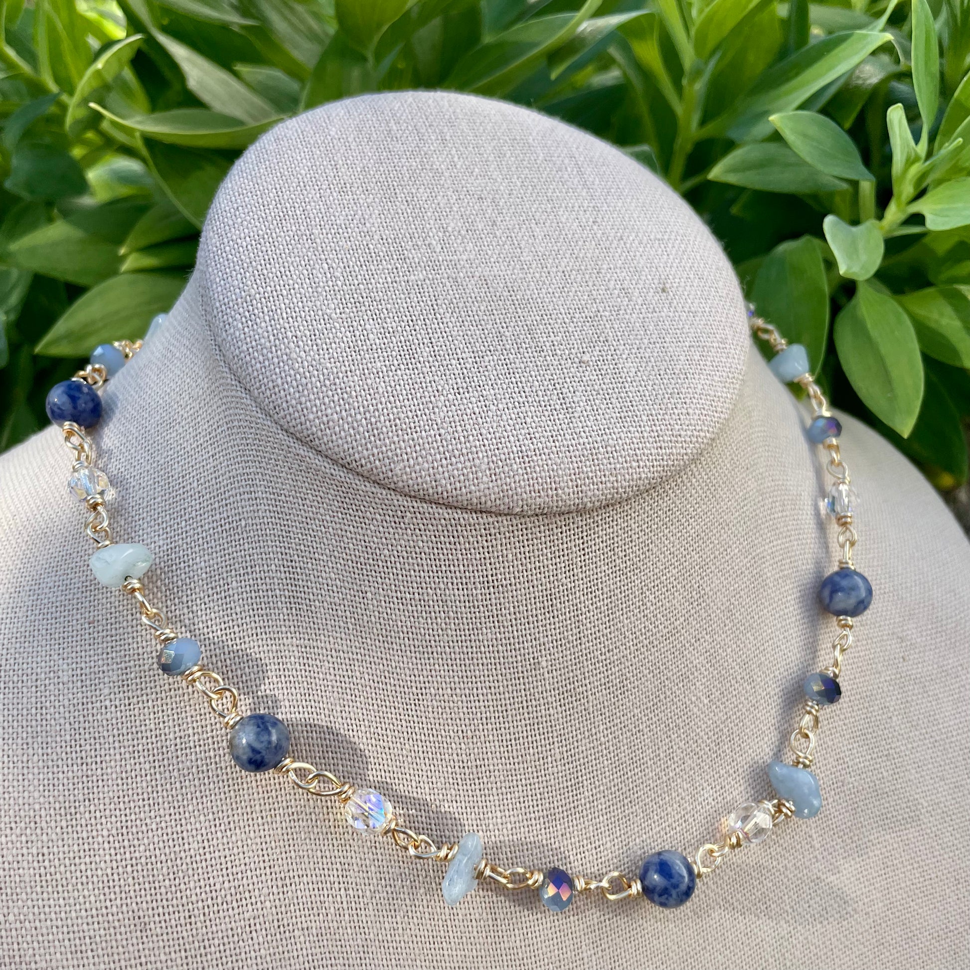 Sodalite, Aquamarine, and iridescent glass beads designed as a brass 15-16” adjustable beaded choker.