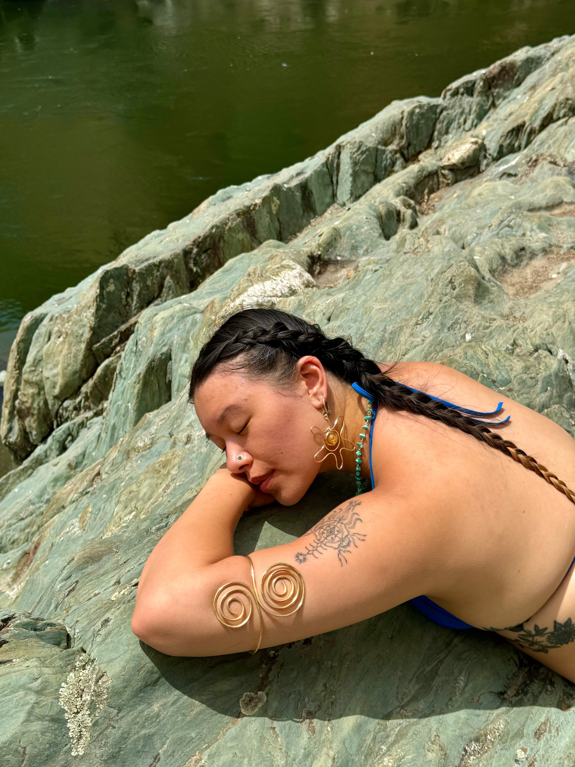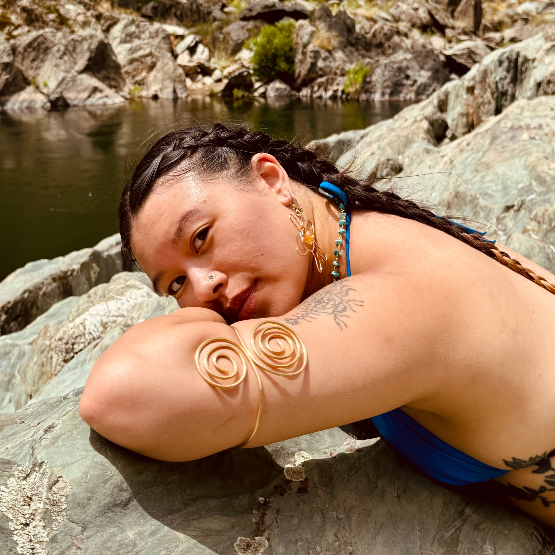 Double spiral adjustable arm cuff in pure brass. Highly adjustable fits arm size S-L