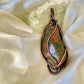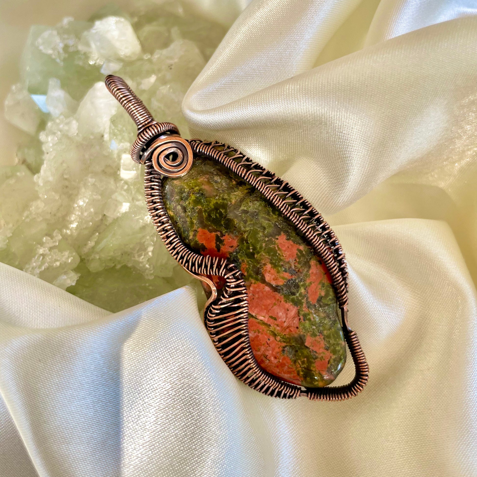 A large one of one Unakite statement piece handwoven in antiqued copper. This piece is reversible and can be worn 3 ways. Unakite facilitates in dream healing, enhancing intuition & psychic ability.