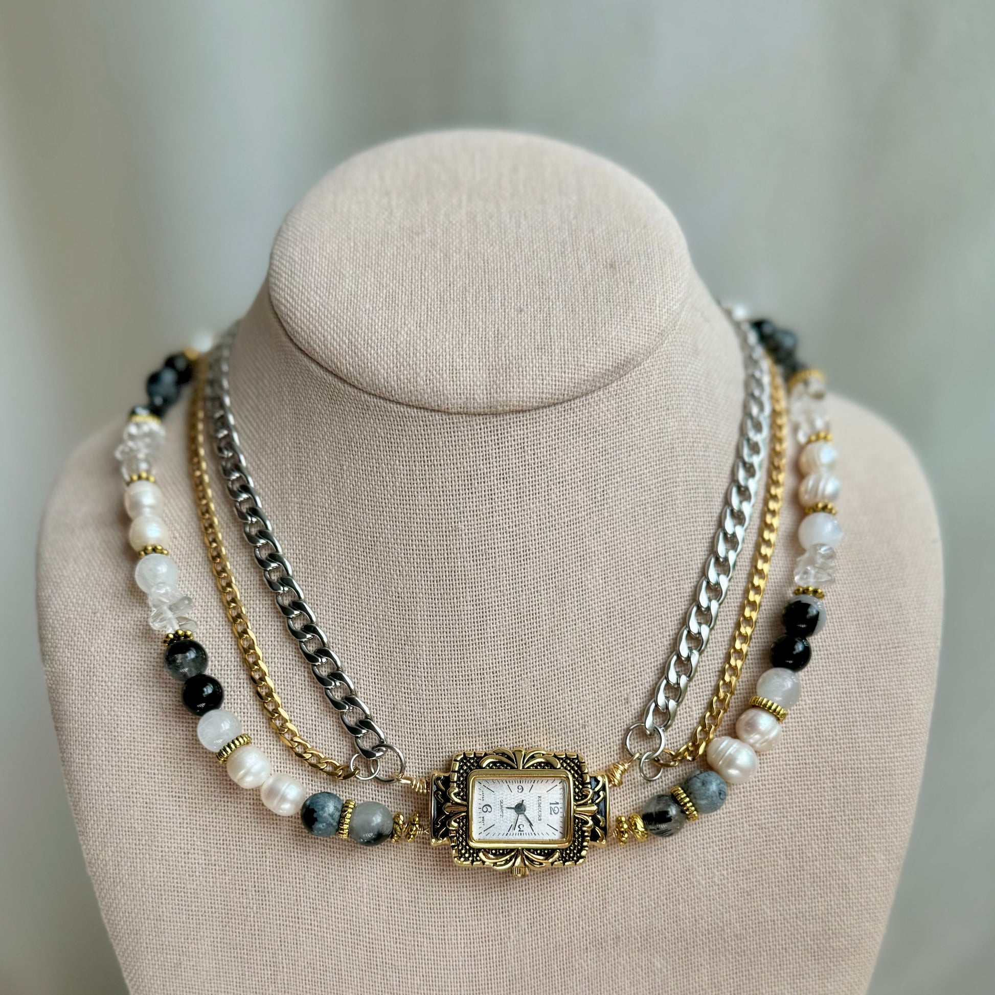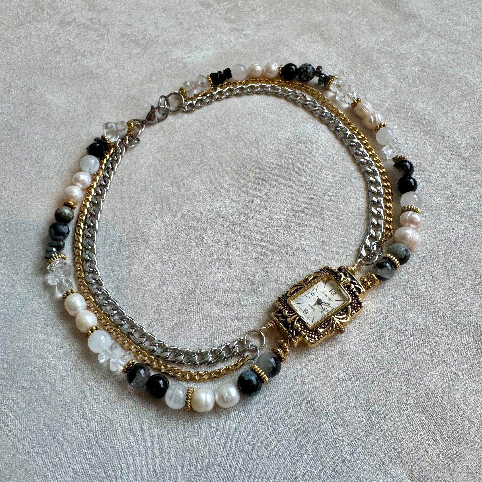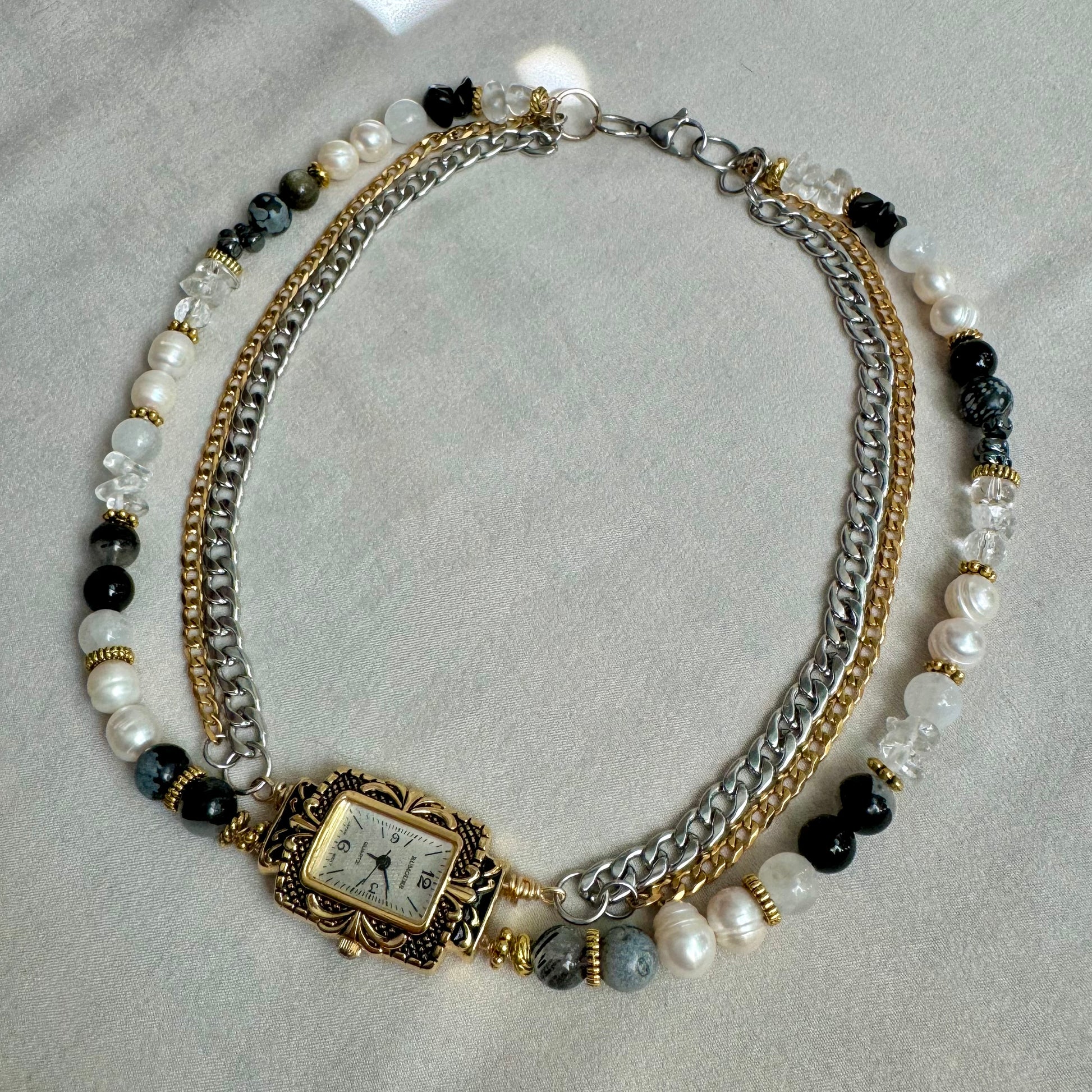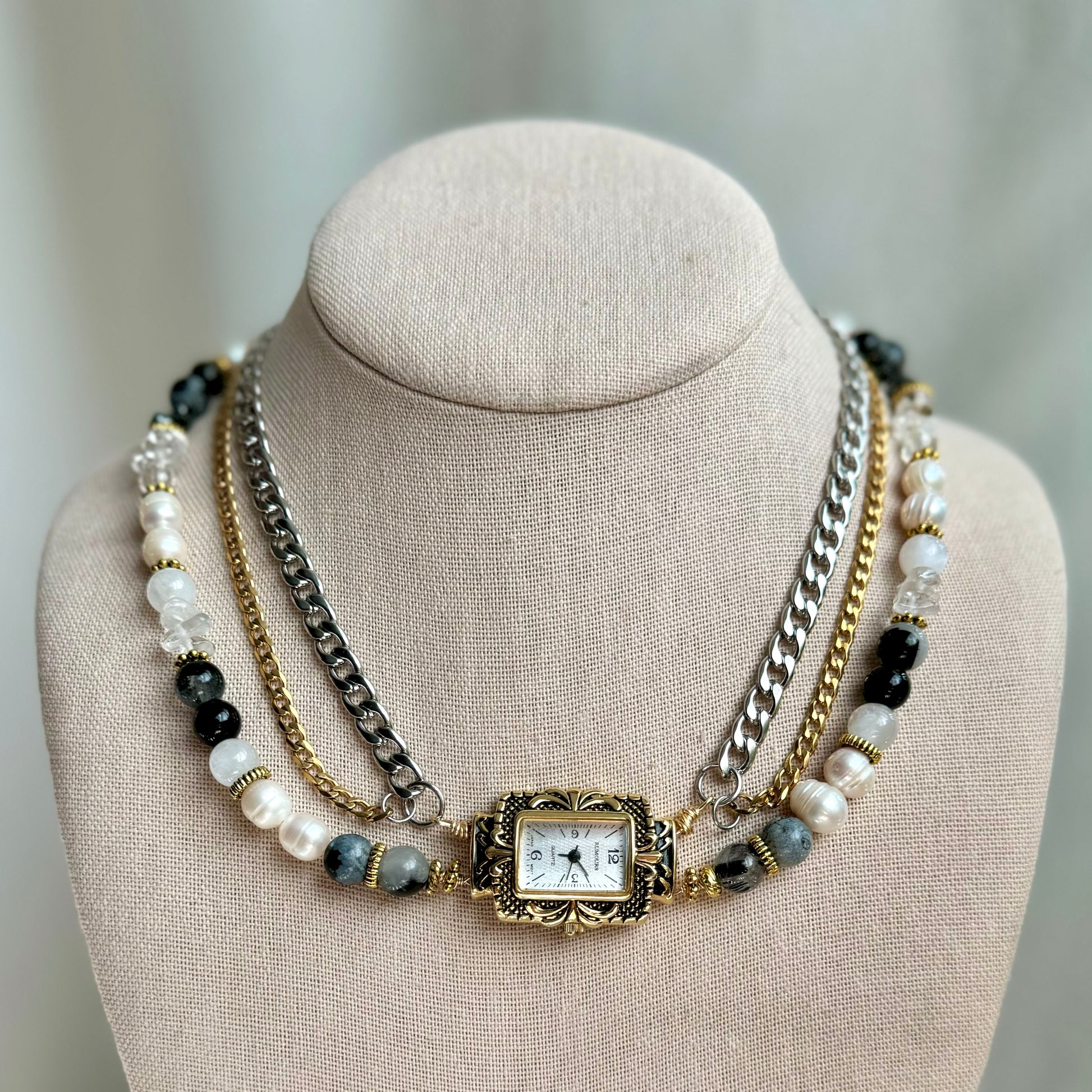 multi-layered upcycled watch choker featuring beaded choker, stainless steel, and gold 15-16” adjustable length chains